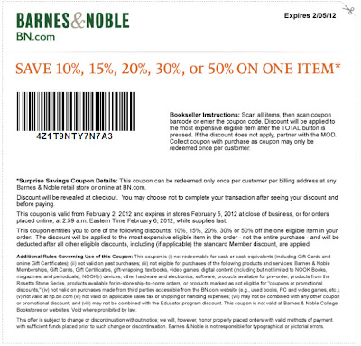 10-50% on one item at Barnes and Noble. Expires Feb. 5.